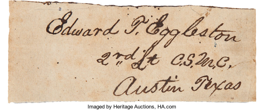 Cut Signature of Confederate Marine Corps Officer. Cut signature inscribed: "Edward T. Eggleston/ 2nd Lt C.S.M.C./ Austin, Texas". Excised from the marbled endpaper of a book likely owned by Eggleston.