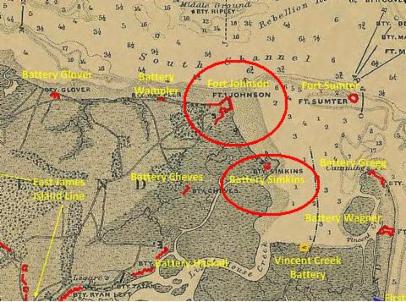 James Island (1861) Lage von Fort Johnson und der Simpkinns Battery
