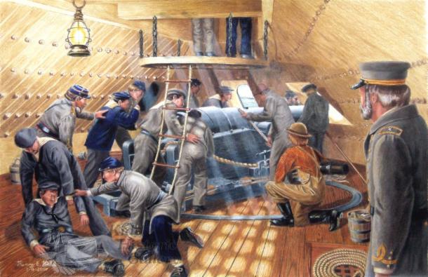 Während dessen, an Bord der Jamestown, bedienten die Marines unter Lt. James R.Y. Fendall eine der zwei großen Kanonen mit „Ruhe, Schnelligkeit & Präzision“.