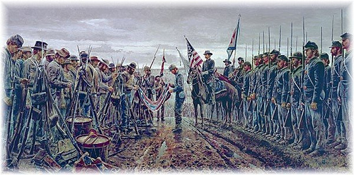 Lee zog weiter nach Appomatox, wo sich die Army of Vorginia am 09. April 1865 ein letztes Mal dem Feind stellte. Trotz der zuerst mit Erfolg vorgetragenn Attacken der CS Cavallery musste Lee nach Rückmeldung über weiter aufmarschierende Corps der Unionsarmee, widerwillig Verhandlungen mit General Sherman aufnehmen. Während die Schlacht weiterging und die Konföderierten immer mehr eingekesselt wurden, gelang es einen Waffenstillstand auszuhandeln. Die meisten Offiziere stimmten Lee´s Entscheidung zu, es wurden aber auch Bedenken laut, das dies die Katitulation aller CS Truppen nach sich ziehen würde. Dem war auch so!