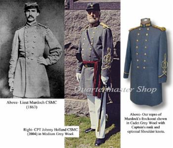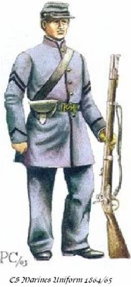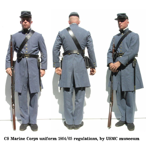 Typisch für das CS Marine Corps waren die Verwendung von "scrip M buttons" aus GB, Ebenso, dass enlisted marines einen 7 button front frock coat trugen. Ob das USMC Stoff/Metall Abzeichen tatsächlich getragen wurde ist ungewiss.